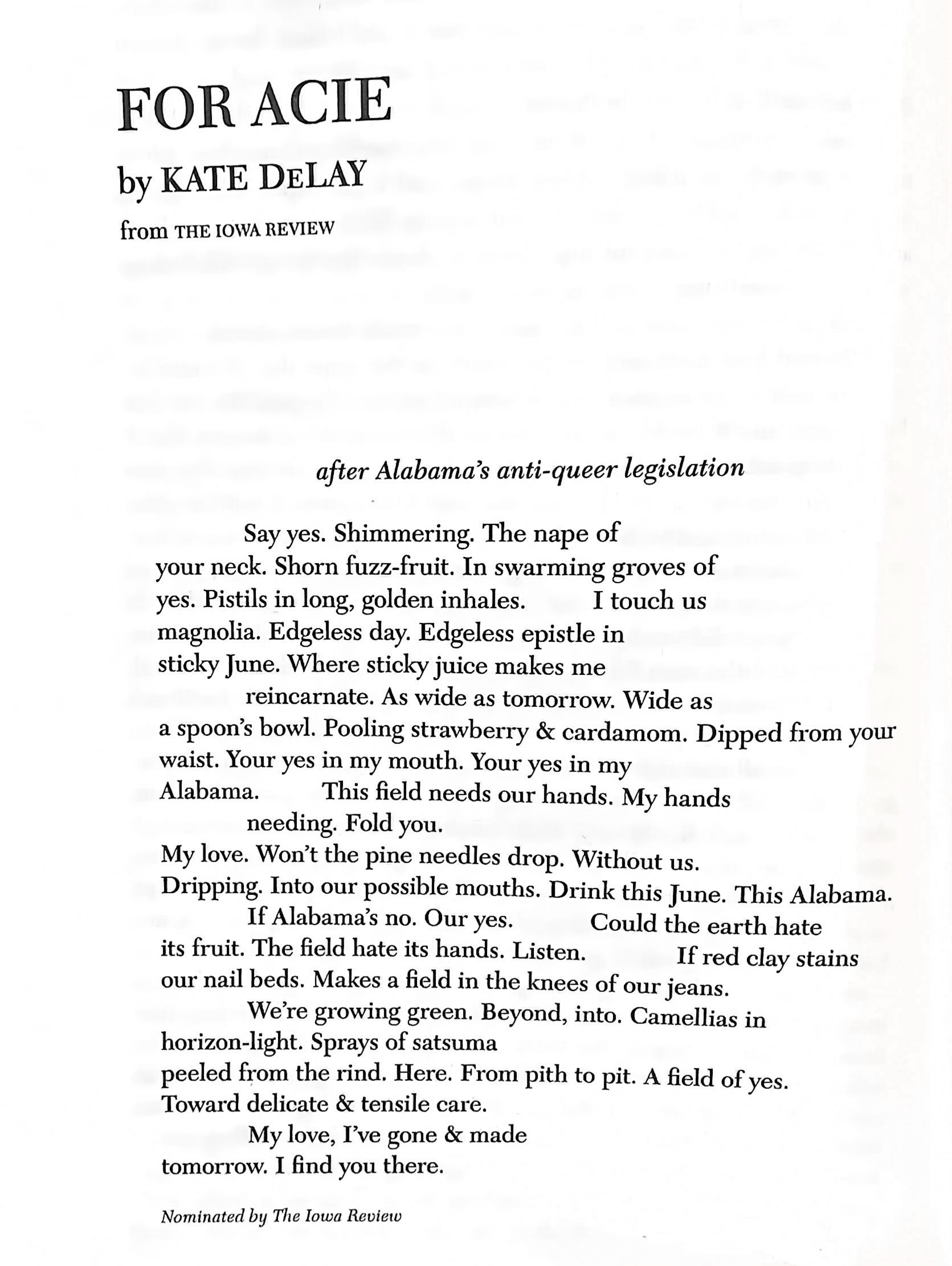 - Pushcart Prize XLVIV Anthology, “for Acie,” 2025